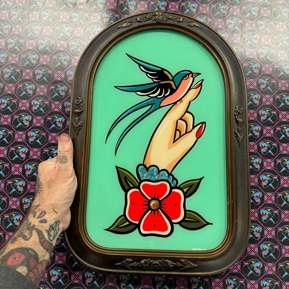 Painted on glass w/ enamel paint & glitter. framed in a repurposed antique wood frame.