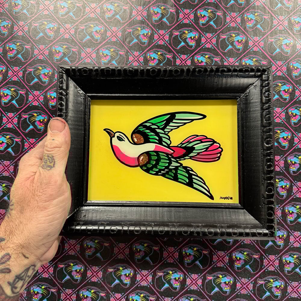 Painted on glass w/ enamel paint & glitter. framed in a repurposed wood frame.