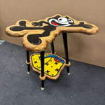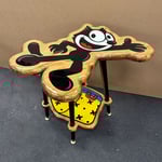Hand cut wood, stained, hand painted, & epoxy coated. Wood legs