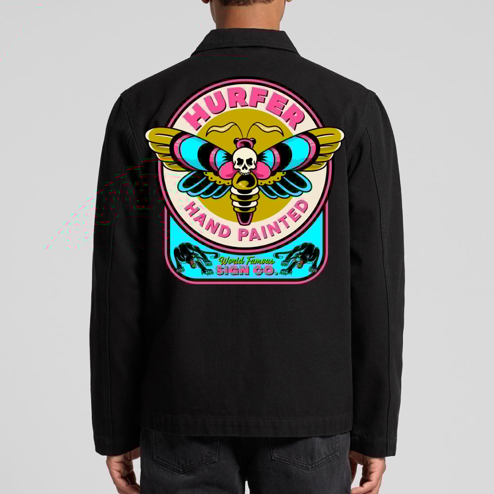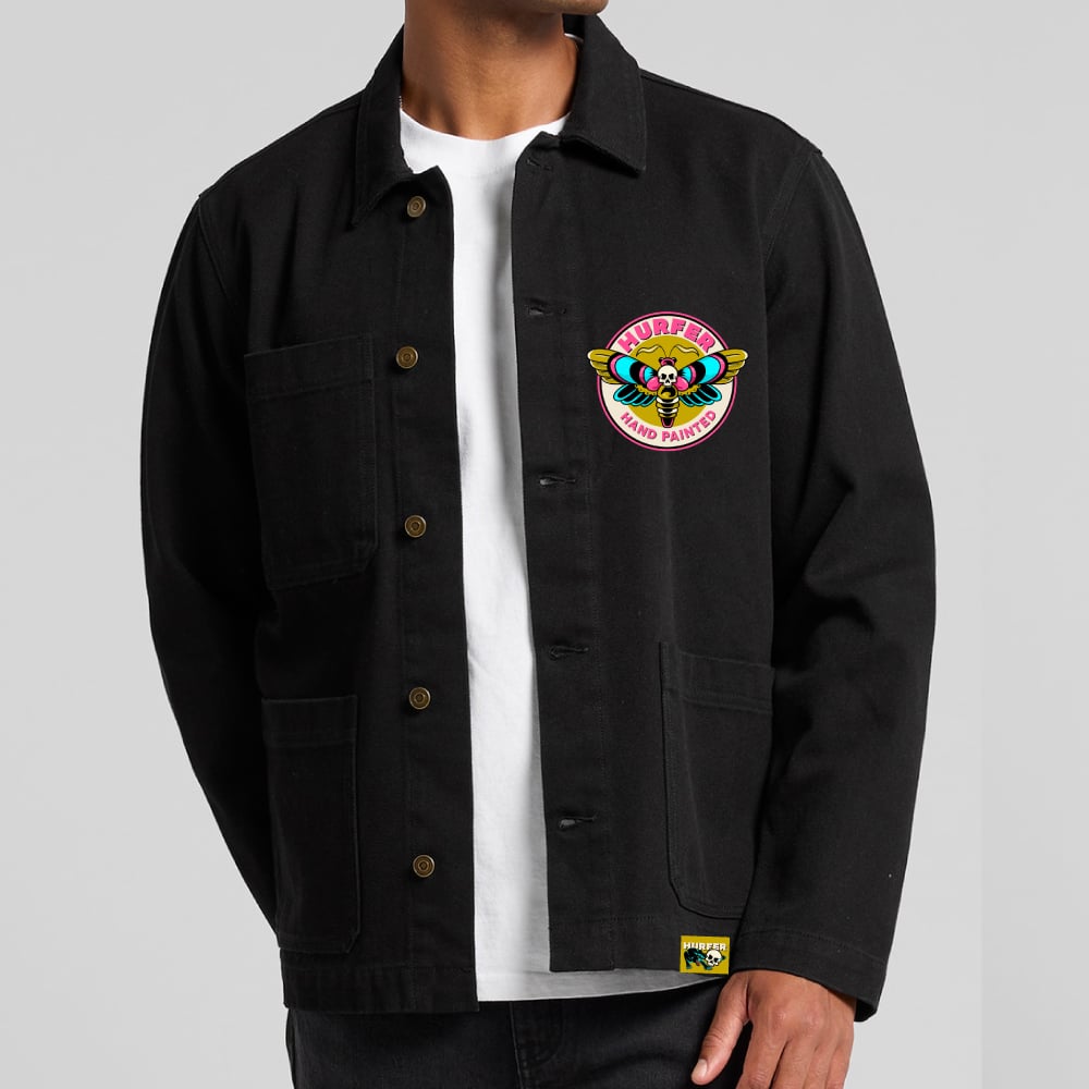 Three pockets, collared shirt jacket, unlined, YKK shank buttons to close