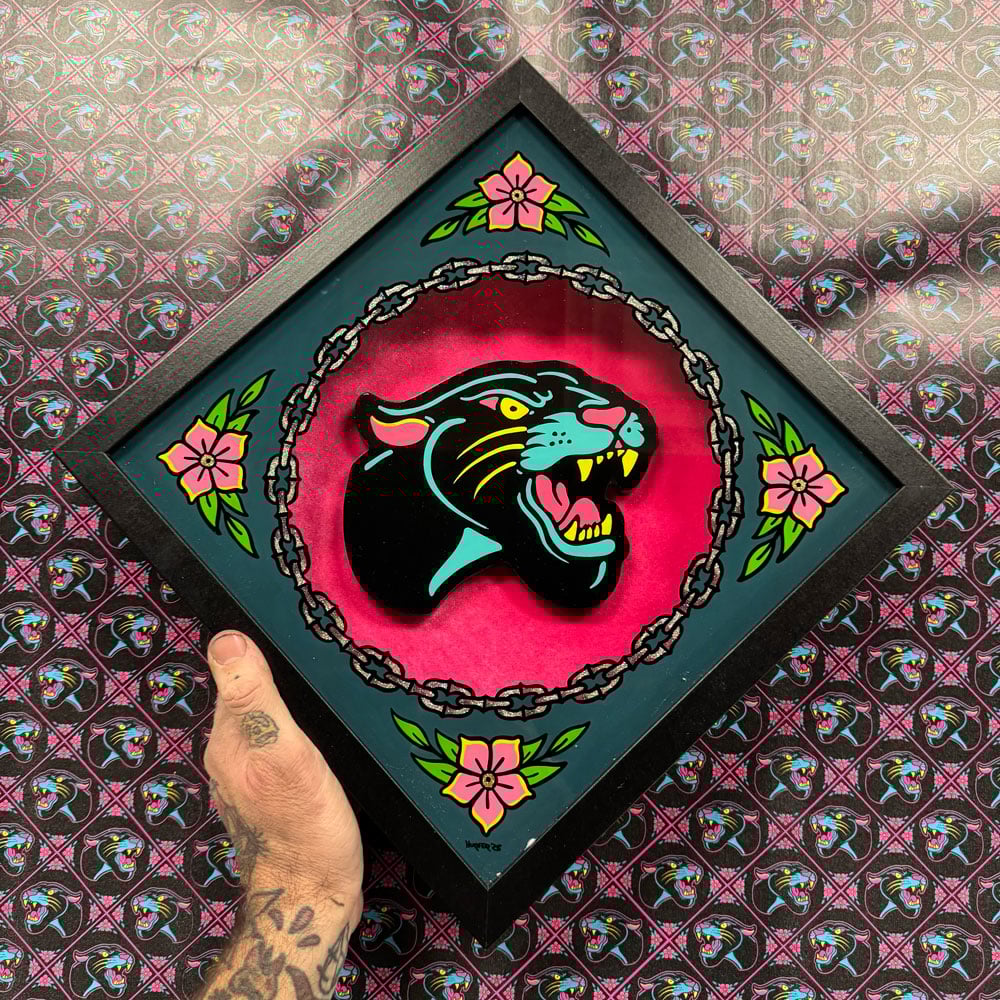 Hand cut hand painted wood cutout. Mounted over velvet in a frame reverse painted on glass.